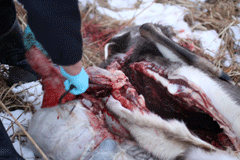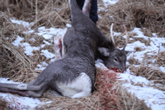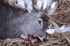 鹿が倒れた場所まで来ると、まず愛用のナイフで頸動脈を切断します。すると血が勢い良く吹き出します。そして、小腸・大腸や胃など可食でない内臓は取り出し、放置はできない為ごみ袋に入れて持ち帰ります。