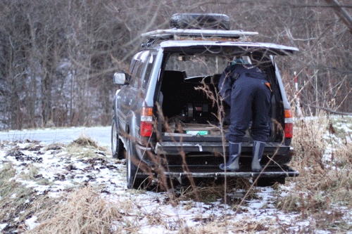 早速ハンティングへ。白糠町は、町全体が低い山で囲まれており、そこには白樺や楓、山モミジなどが自生しています。すでに葉っぱはすべて落ちており、むき出した大地と色を失った森が濃い茶色をしており、まさに蝦夷鹿の色。完璧なカモフラージュを施された鹿を愛用のランドクルーザーにまたがって探しに行きます。