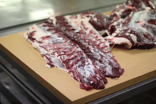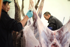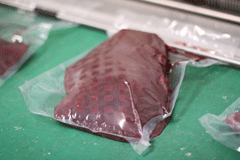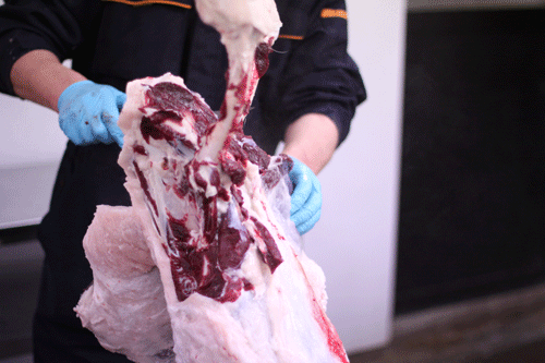 基本的には、まずウデ肉を骨ごと取り外します。ウデ肉とは前足の肉のことで弊社の商品で肩肉。そして次にもも肉を骨より取り外します。そこには、内モモ・しんたま・外モモ・ランプ・スネ肉がついています。骨付きの注文には、スネ肉からランプまで骨付きの状態で取り外します。次は、背中からロース肉。そして、ヒレ肉。最後にチェーンソーでバラ肉を骨ごと切落します。約60kgを超える