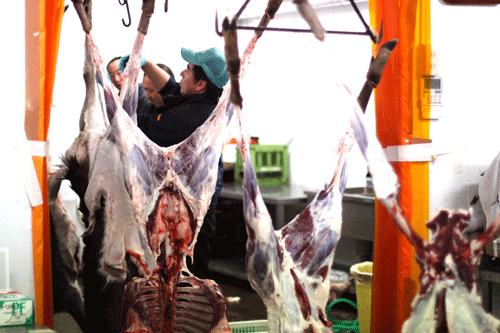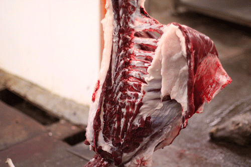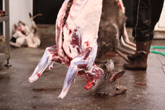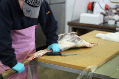 この皮の剥ぎ取り作業、牛や豚、羊などを生産する大規模な工場では機械で行いますが、ここでは一頭づつナイフで薄皮を切剥がす要領で行います。