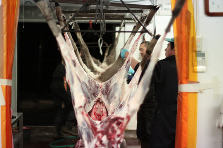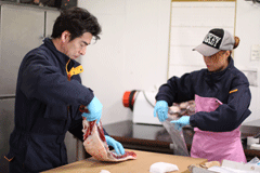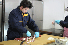 牧場の一角に設けられた加工場まで持ち込まれた鹿は、必ずその日の内に皮をはぎ取り、出荷されるパーツまでに分解します。そうすることで、汚染が少なく鮮度の高い鹿肉を提供できます。