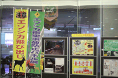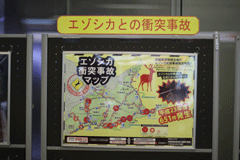 空港のゲートをくぐると、早速あらわれたのは蝦夷鹿が絡む事故に対する啓発の数々。ほとんどの事故は日の入り後に発生しており、夜行性の蝦夷鹿が車や電車のライトに引き寄せられて飛び出してくるそうです。