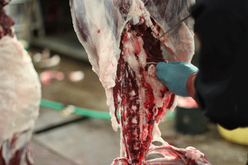 ちなみに、可食内臓である心臓・肝臓・腎臓は基本的にサービス品として出荷しています。(約¥600/kg)。鹿の内臓に通る血管には寄生虫がいるため、食するには加熱が絶対条件ですが、ソースを作る際などに使用するために依頼されるシェフも多いです。寄生虫は血を吸う虫の「ヒル」のような茶色くて、のっぺりとした形をしています。一つの内臓からうようよと這い出てくることもありますので、注意してください。基本的には血管を切っていくと内部にくっ付いています。