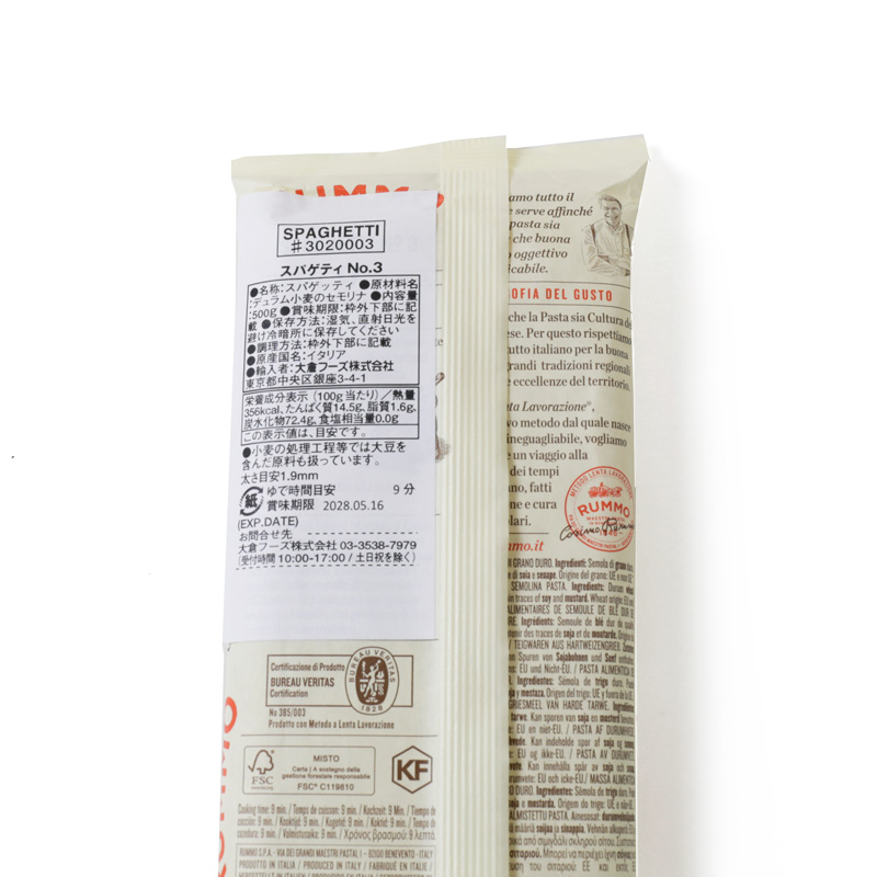 商品名ルンモ レンタラヴォラツィオーネ スパゲティ No3(1.90mm) 500g