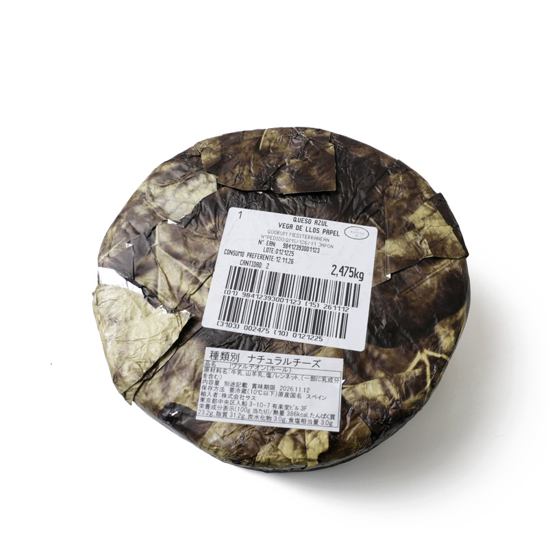 ヴァルデオン ホール 熟成1ヶ月/楓の葉で包んで熟成させたブルーチーズ 2kgの特徴仕様・バルデオンとはピコス・デ・エウロパ山脈の南支脈にある深い谷の名前です。牛乳、山羊乳(殺菌乳)で作られ、塩水につけた楓の葉につつまれて、大切に熟成された複雑な風味のブルーチーズで、イタリアのゴルゴンゾーラなどと同種の青かびチーズです。内部には青かびがパセリ状にひろがり、表皮には自然に生えた白かびが見えます。両手のひらに乗るくらいの固まり(2〜3kg)で、まわりは楓の葉で覆われています。やや甘みを感じるクセのない穏やかな味で、カブラレスよりも食べやすく、近年人気上昇中。 青かび特有のピリピリした刺激は少なく、程よい塩味でクリーミーなバター香もあります。微かな苦味と旨みがあり、酸味との調和も取れたマイルドなチーズです。 お召し上がり方